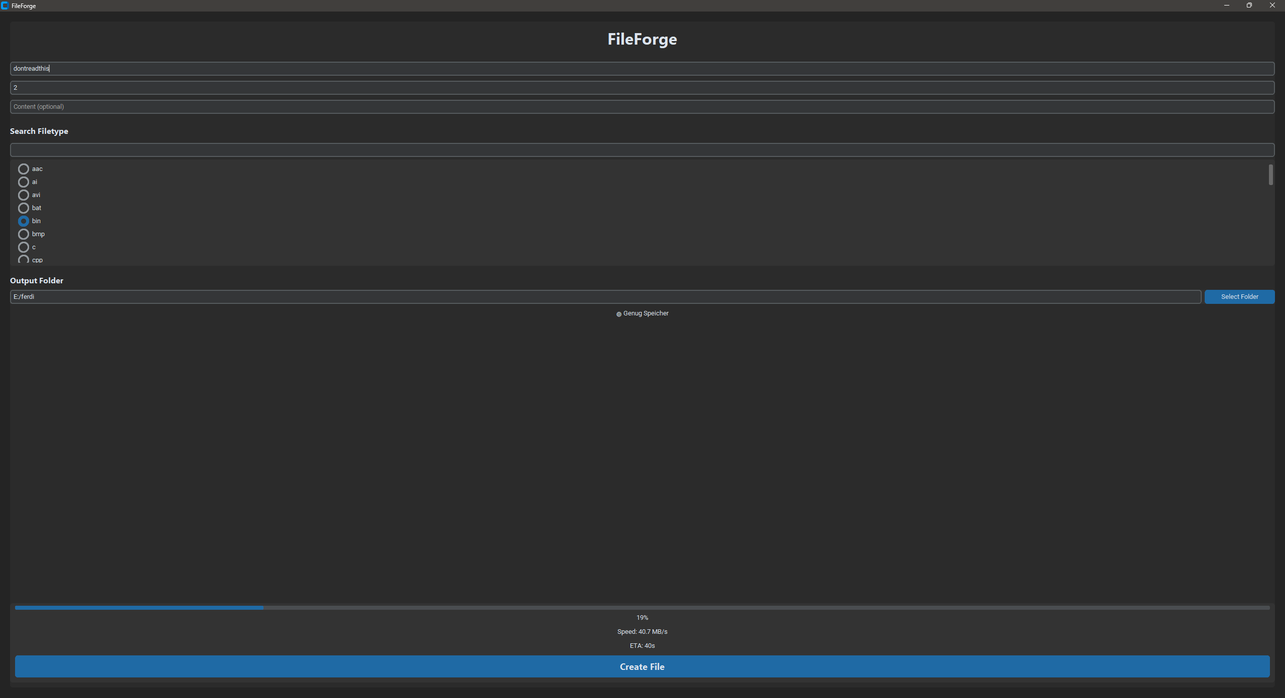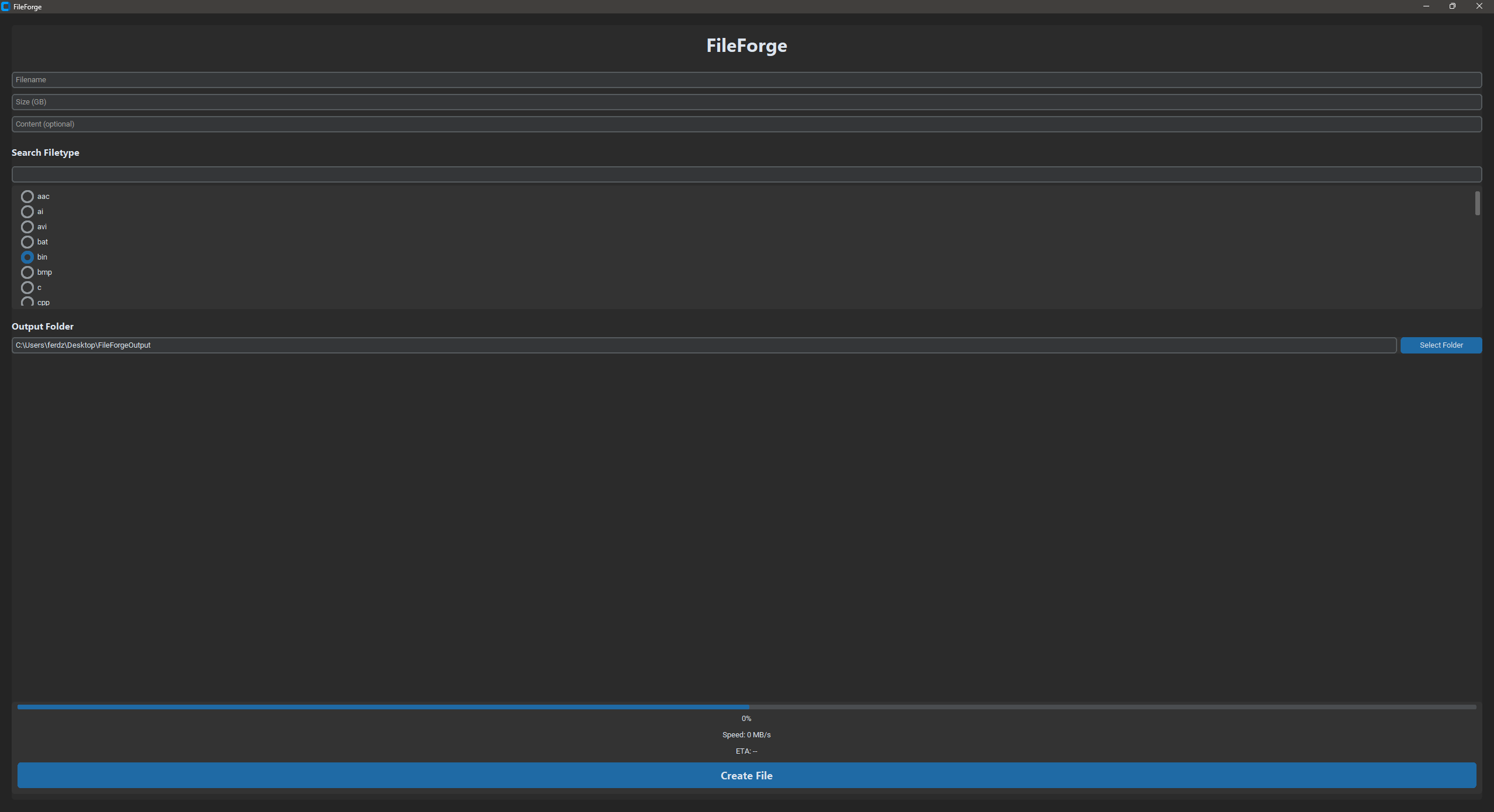 FileForge is a powerful desktop utility designed to create large files of any size quickly and efficiently. Whether you need placeholder files for testing, storage management, or custom content, FileForge gives you full control.